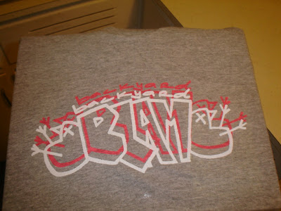 lindo and i printed up some shirts to give away on sunday. let me just say it was not an easy task. it probably would've been a little easier had i burned a test screen in the first place, but what the hell do i know? it was our first time screen printing and we didn't know what we were doing. we finally figured it out though, just in time too. i was about to shank a fool.